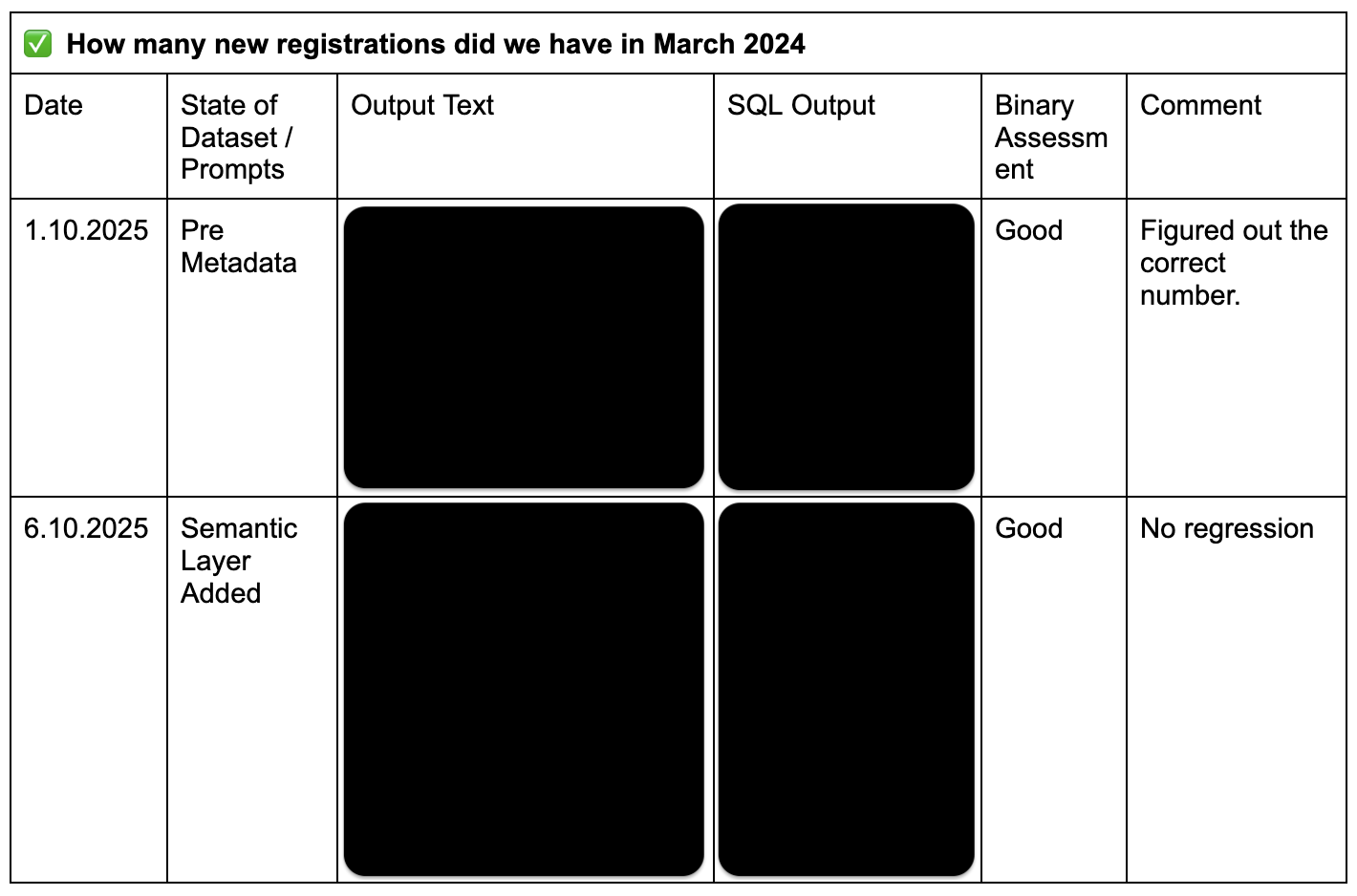 Die Paare aus Fragestellung und idealer Antwort, die Ihr gerade definiert habt, haben einen Namen: Evals. Das Wort wird Euch in der Generative-AI-Welt immer wieder begegnen und es klingt technischer, als es an dieser Stelle ist. Im Grunde sind Evals einfach Testfälle: "Wenn ich das hier reingebe, sollte ungefähr das hier rauskommen." und für den aktuellen Stand, können die in einem Spreadsheet oder Textdokument leben. Ein Tipp: Fügt einfach eine Zeile für jede Iteration Eures Contexts und Prompts hinzu.